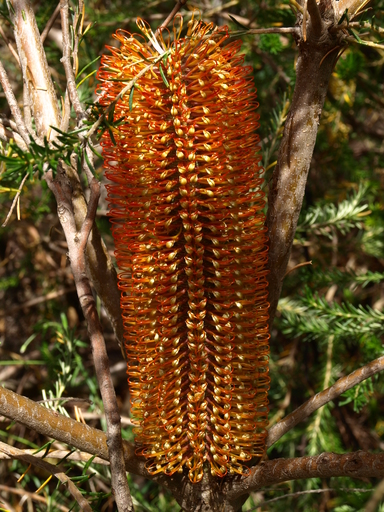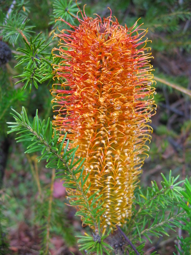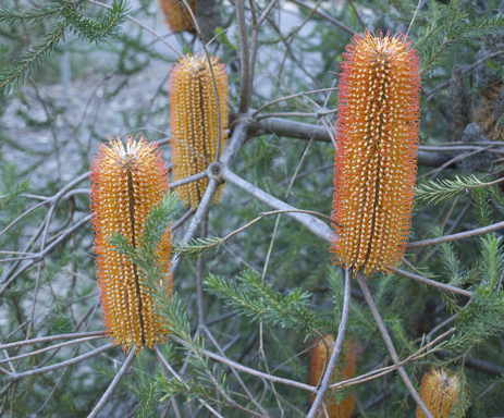 Large bushy shrub 5mH x 4mW. Bright green linear leaves, cylindrical orange flowers from April to Sept. Hardy screen or hedge plant in most positions with moist well-drained soil. Bird attractant.